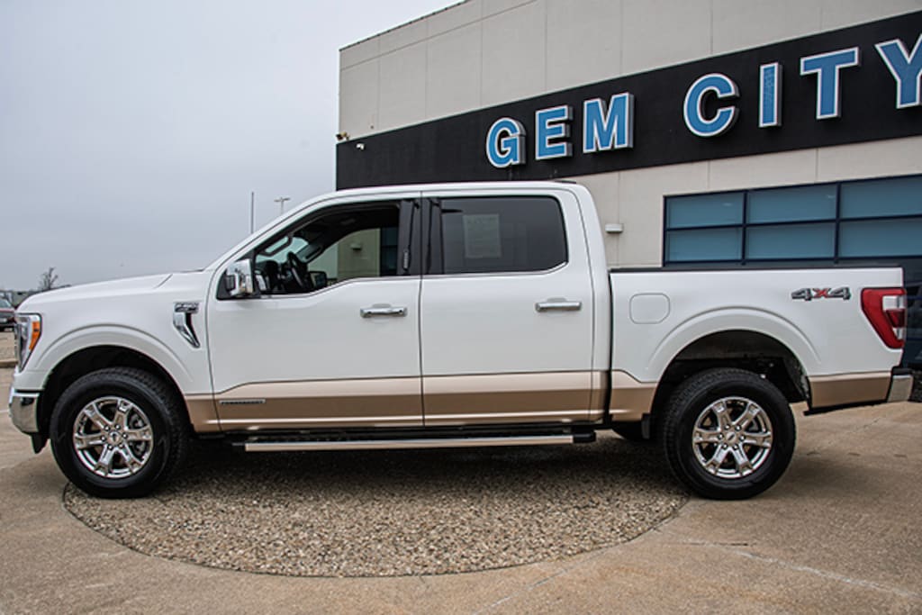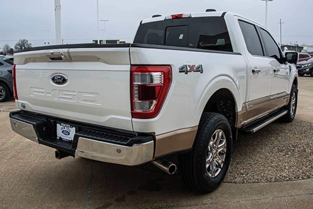 Local Trade, Star White Metallic Tri-Coat 2022 Ford F-150 Lariat 501A 4WD 10-Speed Automatic 3.5L PowerBoost Full-Hybrid V6, 3.5L PowerBoost Full-Hybrid V6, 4WD, 360 Degree Camera, 4-Wheel Disc Brakes, 6" Bright Polished Running Board, 7 Speakers, ABS brakes, Adjustable pedals, Air Conditioning, Alloy wheels, AM/FM radio: SiriusXM with 360L, Auto High-beam Headlights, Auto Start-Stop Removal, Auto-dimming door mirrors, Auto-dimming Rear-View mirror, Automatic temperature control, Bed Utility Package, BoxLink, Brake assist, Bumpers: chrome, Chrome 2-Bar Grille w/4 Minor Bars, Chrome Door & Tailgate Handles w/Body-Color Bezel, Chrome Single-Tip Exhaust, Chrome Skull Caps on Exterior Mirrors, Class IV Trailer Hitch Receiver, Compass, Connected Built-In Navigation, Delay-off headlights, Driver door bin, Driver vanity mirror, Dual front impact airbags, Dual front side impact airbags, Electronic Locking w/3.73 Axle Ratio, Electronic Stability Control, Emergency communication system: SYNC 4 911 Assist, Equipment Group 501A Mid, Evasive Steering Assist, Exterior Parking Camera Rear, Ford Co-Pilot360 Assist 2.0 (DISC), Front anti-roll bar, Front Center Armrest w/Storage, Front dual zone A/C, Front fog lights, Front License Plate Bracket, Front reading lights, Front wheel independent suspension, Fully automatic headlights, GVWR: 7,350 lbs Payload Package, Heated door mirrors, Heated front seats, Illuminated entry, Integrated Trailer Brake Controller, Intelligent Adaptive Cruise Control w/Stop & Go, Intersection Assist, Lariat Chrome Appearance Package, Leather-Trimmed Bucket Seats, LED Box Lighting, Low tire pressure warning, Memory seat, Occupant sensing airbag, Onboard 400W Outlet, Outside temperature display, Overhead airbag, Overhead console, Panic alarm, Passenger door bin, Passenger vanity mirror, Pedal memory, Power door mirrors, Power driver seat, Power passenger seat, Power steering, Power Tailgate / Tailgate Step, Power windows, Pro Power Onboard - 7.2KW, Pro Trailer Backup Assist, Radio data system, Radio: AM/FM SiriusXM w/360L, Radio: B&O Sound System by Bang & Olufsen, Rear reading lights, Rear seat center armrest, Rear step bumper, Rear window defroster, Remote keyless entry, Security system, Speed control, Speed Sign Recognition, Speed-sensing steering, Split folding rear seat, Steering wheel mounted audio controls, SYNC 4 w/Enhanced Voice Recognition, Tachometer, Tailgate Step w/Tailgate Work Surface, Telescoping steering wheel, Tilt steering wheel, Traction control, Trailer Tow Package, Tray Style Floor Liner, Tray Style Floor Liner (47W), Trip computer, Turn signal indicator mirrors, Universal Garage Door Opener, Variably intermittent wipers, Ventilated front seats, Voltmeter, Wheels: 18" Chrome-Like PVD, 3.5L PowerBoost Full-Hybrid V6, 4WD.