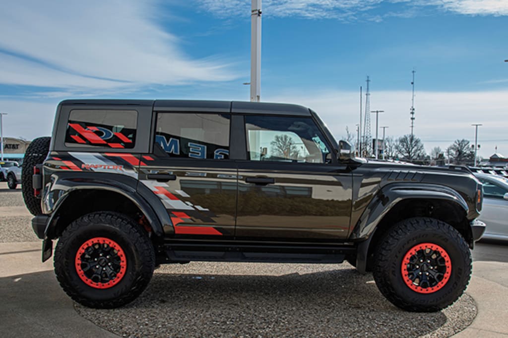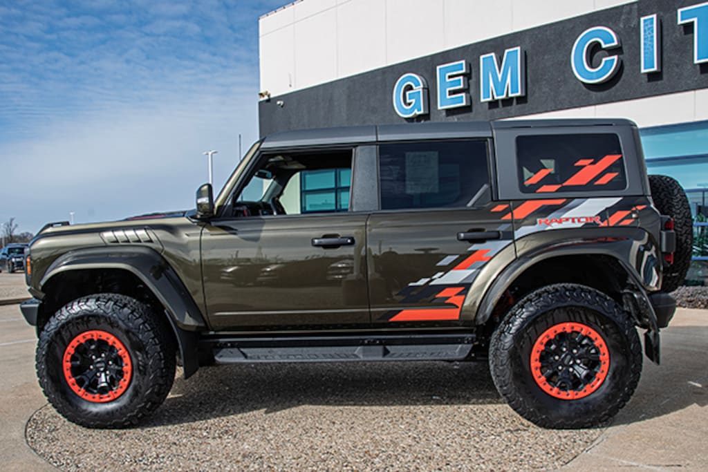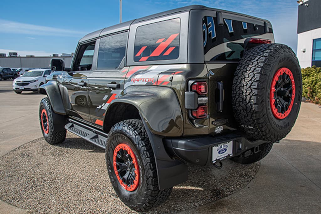 Local Trade, Shelter Green Metallic 2024 Ford Bronco Raptor 374A 4WD 10-Speed Automatic 3.0L EcoBoost V6, Body-Color Painted Sideview Mirror Caps, Code Orange Accent Seat Belts, Equipment Group 374A High/Lux Package, Raptor Code Orange Appearance Package, Wheels: 17" Dark Carbonized Gray Alloy Painted, 10 Speakers, 4-Wheel Disc Brakes, ABS brakes, Air Conditioning, Alloy wheels, AM/FM radio: SiriusXM with 360L, Auto High-beam Headlights, Auto-dimming Rear-View mirror, Automatic temperature control, Brake assist, Compass, Connected Navigation, Convertible HardTop, Convertible roof lining, Delay-off headlights, Driver door bin, Driver vanity mirror, Dual front impact airbags, Dual front side impact airbags, Electronic Stability Control, Emergency communication system: 911 Assist, Engine Block Heater, Exterior Parking Camera Rear, Front anti-roll bar, Front Bucket Seats, Front Center Armrest, Front dual zone A/C, Front fog lights, Front License Plate Bracket, Front reading lights, Front wheel independent suspension, Fully automatic headlights, Garage door transmitter, Glass rear window, Heated door mirrors, Heated front seats, Heated steering wheel, Illuminated entry, Integrated roll-over protection, Interior Carbon Fiber Pack 6, Leather Shift Knob, Low tire pressure warning, Marine Grade Vinyl Bucket Seats, Navigation system: Connected Navigation, Occupant sensing airbag, Outside temperature display, Overhead airbag, Overhead console, Panic alarm, Passenger door bin, Passenger vanity mirror, Power door mirrors, Power steering, Power windows, Radio data system, Radio: B&O Sound System by Bang & Olufsen, Rear anti-roll bar, Rear seat center armrest, Rear window defroster, Rear window wiper, Remote keyless entry, Security system, SiriusXM Radio w/360L, Speed control, Split folding rear seat, Steering wheel mounted audio controls, SYNC 4, Tachometer, Telescoping steering wheel, Tilt steering wheel, Traction control, Trip computer, Turn signal indicator mirrors, Variably intermittent wipers, Voltmeter, Wheels: 17" Black High Gloss-Painted Aluminum, Body-Color Painted Sideview Mirror Caps, Code Orange Accent Seat Belts, Equipment Group 374A High/Lux Package, Raptor Code Orange Appearance Package, Wheels: 17" Dark Carbonized Gray Alloy Painted.