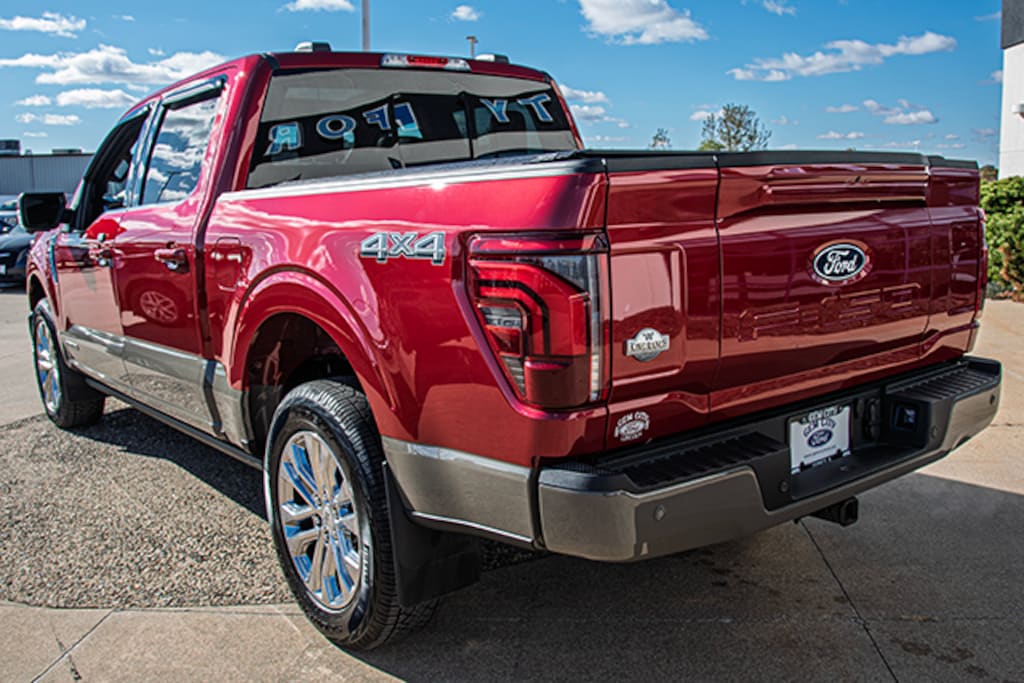 Local Trade, Rapid Red Metallic Tinted Clearcoat 2025 Ford F-150 King Ranch 601A 4WD 10-Speed Automatic 3.5L PowerBoost Full-Hybrid V6, 4WD, Equipment Group 601A High, Max Tow Electronic Locking w/3.73 Axle Ratio, 14 Speakers, 4-Wheel Disc Brakes, ABS brakes, Adjustable pedals, Air Conditioning, Alloy wheels, AM/FM radio: SiriusXM with 360L, Auto High-beam Headlights, Auto tilt-away steering wheel, Auto-dimming door mirrors, Auto-dimming Rear-View mirror, Automatic temperature control, Brake assist, Chrome wheels, Compass, Delay-off headlights, Driver door bin, Driver vanity mirror, Dual front impact airbags, Dual front side impact airbags, Electronic Stability Control, Emergency communication system: SYNC 4 911 Assist, Front anti-roll bar, Front Bucket Seats, Front Center Armrest, Front dual zone A/C, Front fog lights, Front reading lights, Front wheel independent suspension, Fully automatic headlights, Garage door transmitter, Genuine wood dashboard insert, GVWR: 7,400 lbs Payload Package, Heads-Up Display, Heated door mirrors, Heated front seats, Heated rear seats, Heated steering wheel, Illuminated entry, King Ranch Multicontour Leather Bucket Seats, Leather steering wheel, Low tire pressure warning, Memory seat, Navigation system: Connected Navigation, Occupant sensing airbag, Outside temperature display, Overhead airbag, Overhead console, Panic alarm, Passenger door bin, Passenger vanity mirror, Pedal memory, Power door mirrors, Power driver seat, Power moonroof, Power passenger seat, Power steering, Power windows, Radio data system, Radio: B&O Unleashed Sound System by Bang & Olufsen, Rain sensing wipers, Rear reading lights, Rear seat center armrest, Rear step bumper, Rear window defroster, Remote keyless entry, Security system, Speed control, Split folding rear seat, Steering wheel memory, Steering wheel mounted audio controls, SYNC 4 w/Enhanced Voice Recognition, Tachometer, Telescoping steering wheel, Tilt steering wheel, Traction control, Trip computer, Turn signal indicator mirrors, Variably intermittent wipers, Ventilated front seats, Voltmeter, Wheels: 20" Chrome-Like PVD, 3.5L PowerBoost Full-Hybrid V6, 4WD, Equipment Group 601A High, Max Tow Electronic Locking w/3.73 Axle Ratio. Rapid Red Metallic Tinted Clearcoat 2025 Ford F-150 King Ranch 601A 4WD 10-Speed Automatic 3.5L PowerBoost Full-Hybrid V6